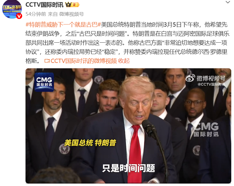 美国总统特朗普当地时间3月5日下午称,他希望先结束伊朗战争,之后“古巴只是时间问题”。